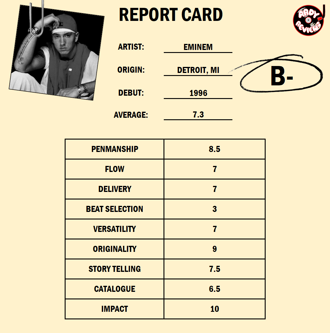 Marshall Mathers, Eminem or Slim Shady has been one of — if not — the most famous rappers to ever walk the planet and grab a microphone. Originally releasing his debut album, Infinite, in 1996; it wouldn’t be until his second and major label debut where everything took off for the Detroit rapper. Signing to Dr. Dre’s Aftermath Entertainment, Eminem released his debut single “My Name Is” and took both the Hip-Hop and Pop world by storm. His first album under the label, The Slim Shady LP, was a critical and commercial success. Commercial success is what would be a regular thing for Eminem, as he is the highest selling rapper of all time and the difference between him and second place isn’t even close. Known for his rhyme schemes and aggressive delivery, Eminem is regarded by many as one of the greatest MCs of all time, whilst many others view him as the greatest period. Today, I will be conducting a brand new report card on the Detroit MC and it’s safe to say I will be upsetting many Eminem fans.
