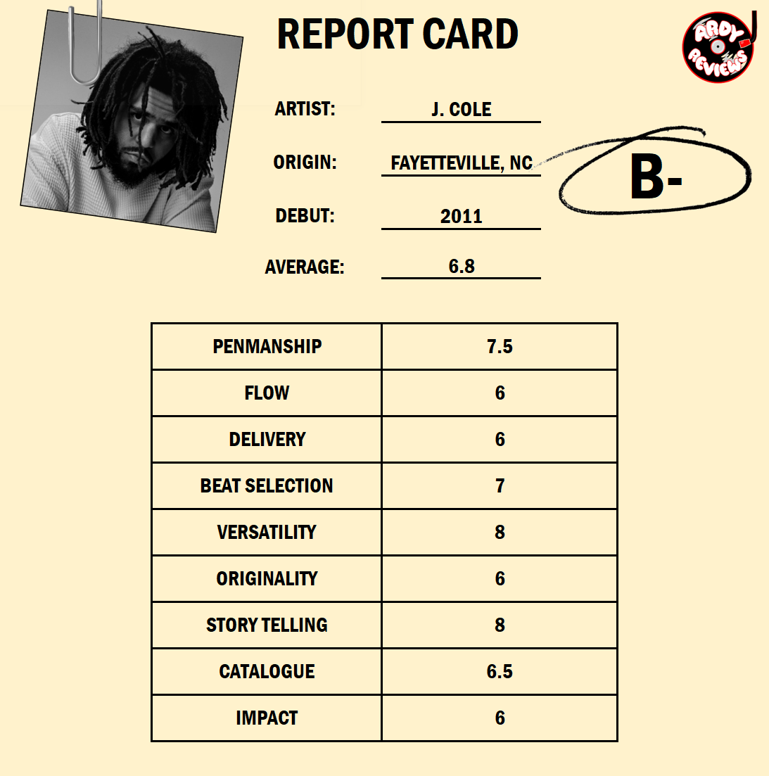In total I have given J. Cole 61 points and an average of 6.8, rounding that to a B-. Overall, I think J. Cole is a good rapper and has good qualities to back this. Cole has created a legacy for himself and will be remembered after he puts the mic down. However, I personally believe that something can be good, but at the same time overrated. Though Cole is a good rapper, I do believe he has been placed on a pedestal that is a bit too high. I don’t believe he is as good as many others claim him to be. I think being a commercially successful rapper has helped him to be placed on that pedestal. Many believe that he is on the same level and a direct competitor to Kendrick Lamar, as he too made a name for himself during the blog era. However, I don’t believe this comparison has ever truly been deserved and the level between two has never been the same to me. So though I believe he is a good rapper, I don’t believe Cole is one of the greats and should not be placed on the same level as other great MCs.